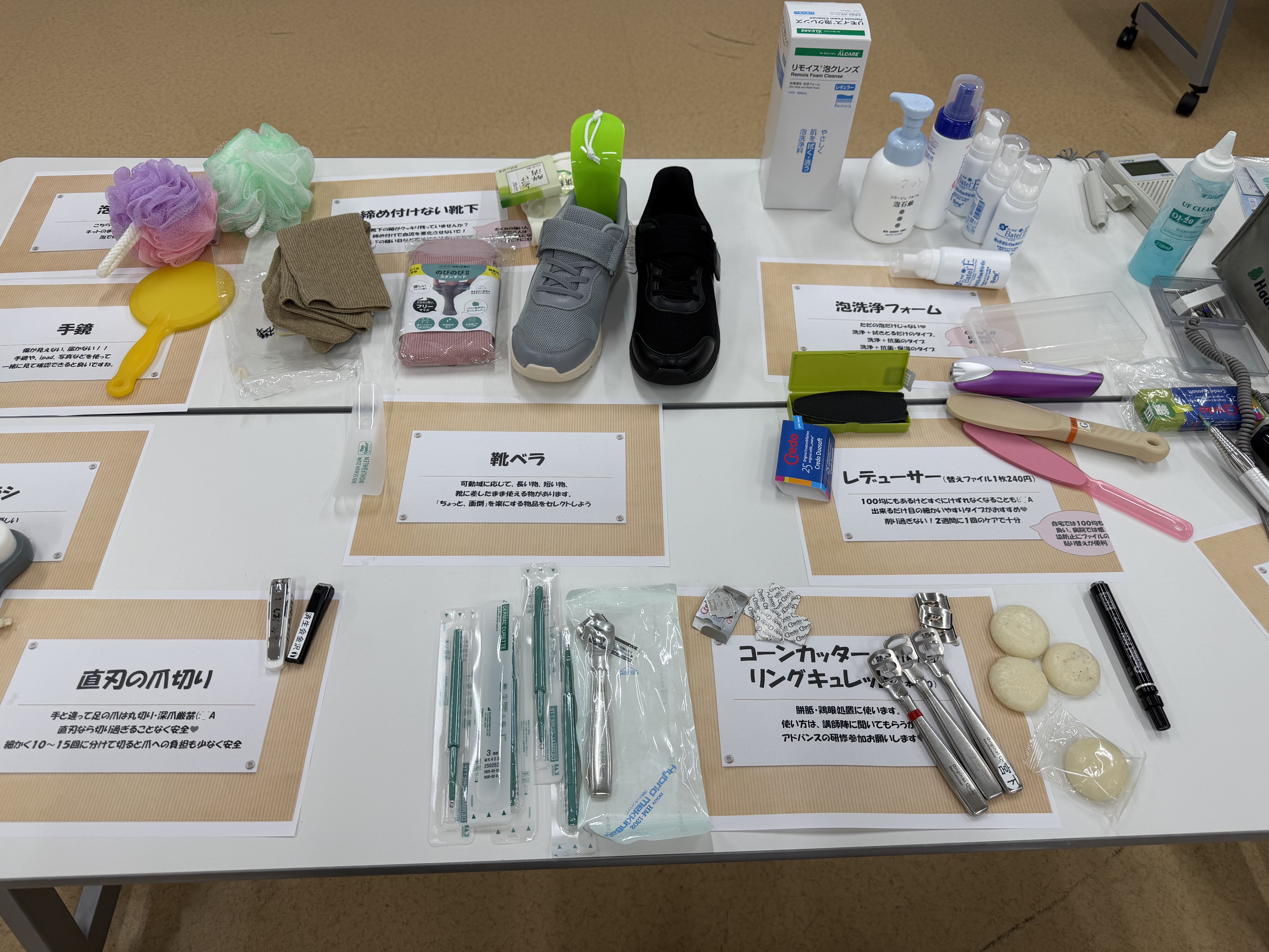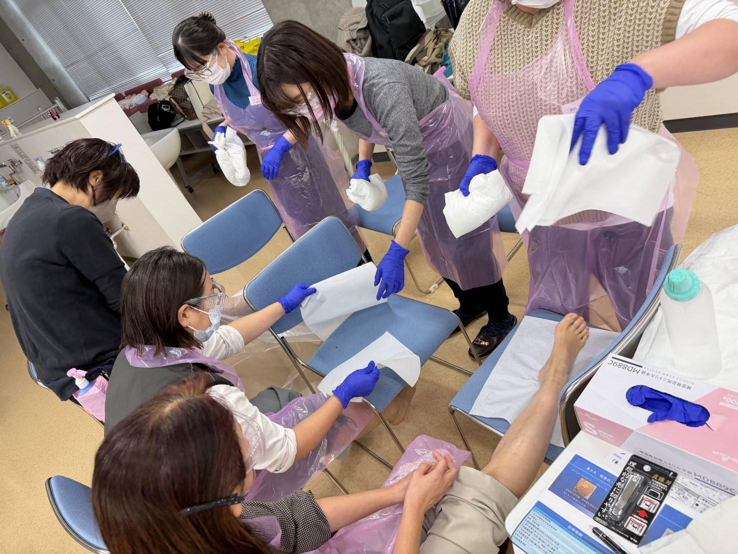 | 10:45~12:35 | 実技:6グループに分かれて対面指導 足の観察・シャボンラッピング・爪切り、ゾンデの使い方・保湿・意見交換(質疑応答) |