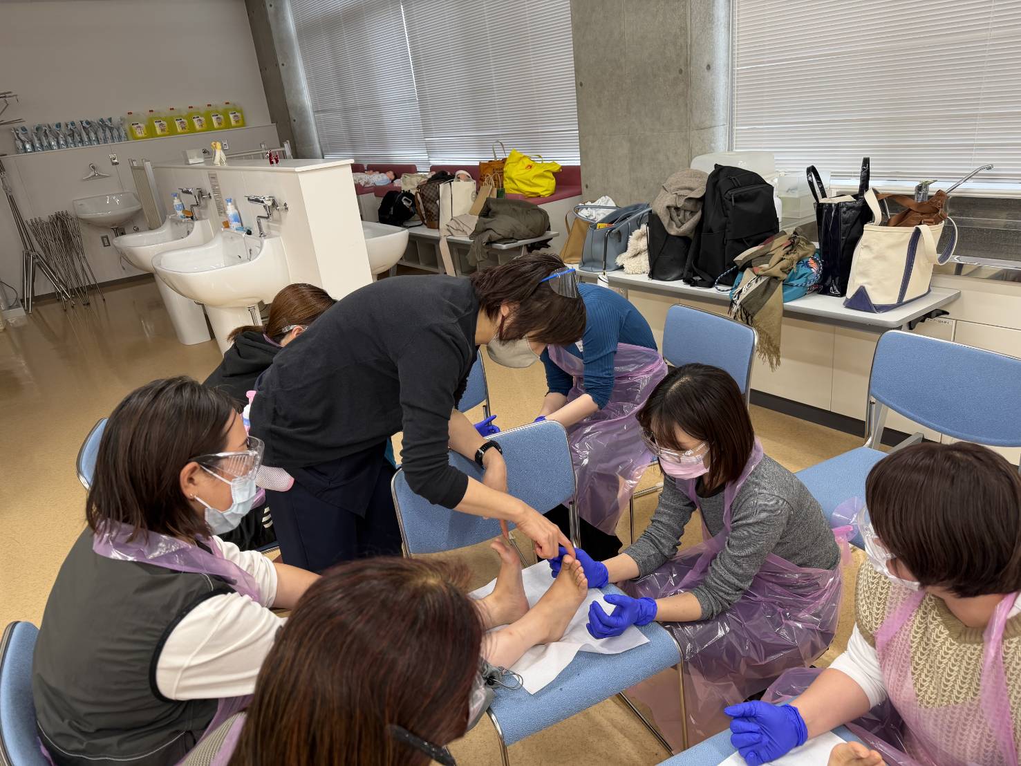 | 10:45~12:35 | 実技:6グループに分かれて対面指導 足の観察・シャボンラッピング・爪切り、ゾンデの使い方・保湿・意見交換(質疑応答) |